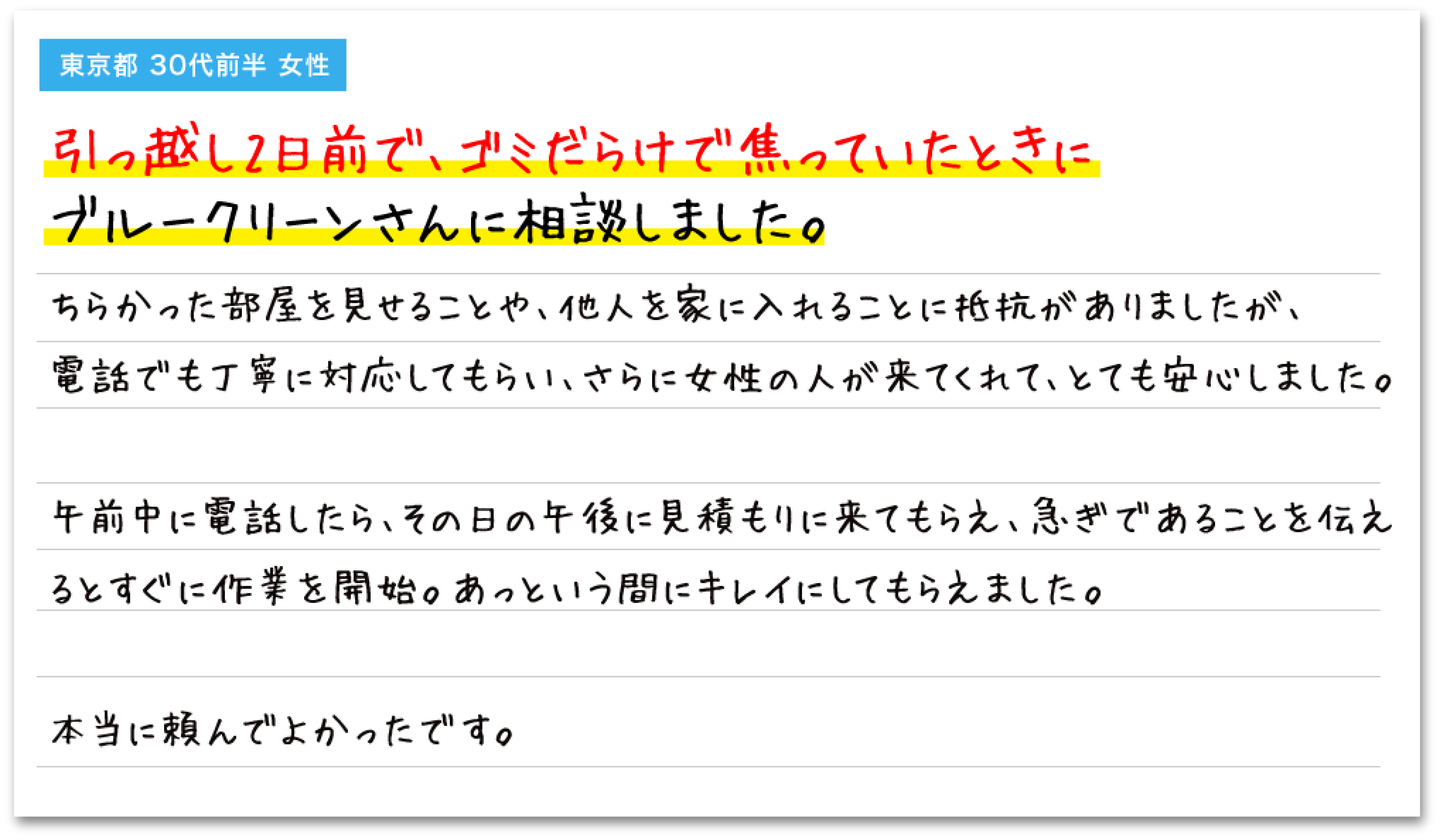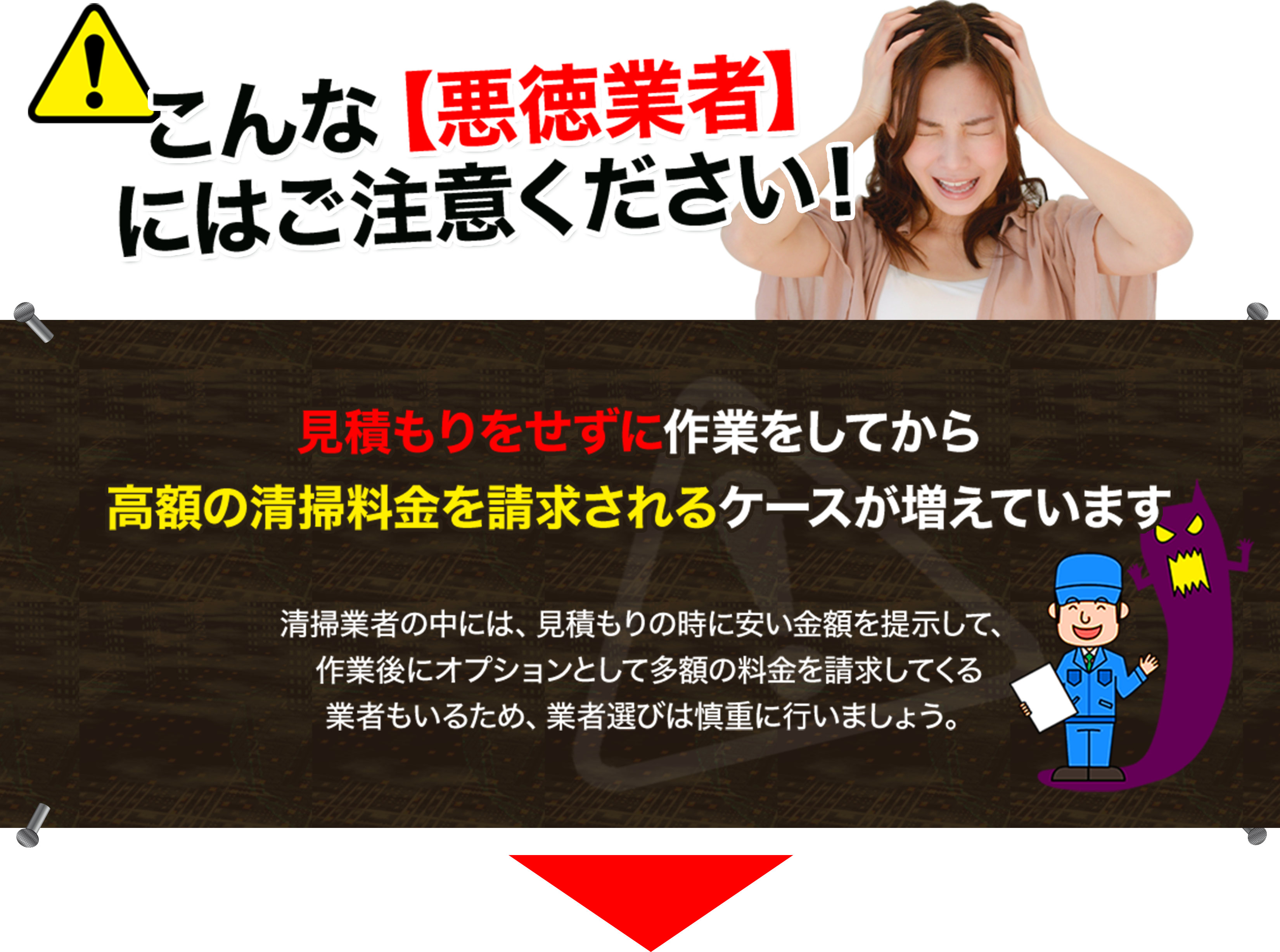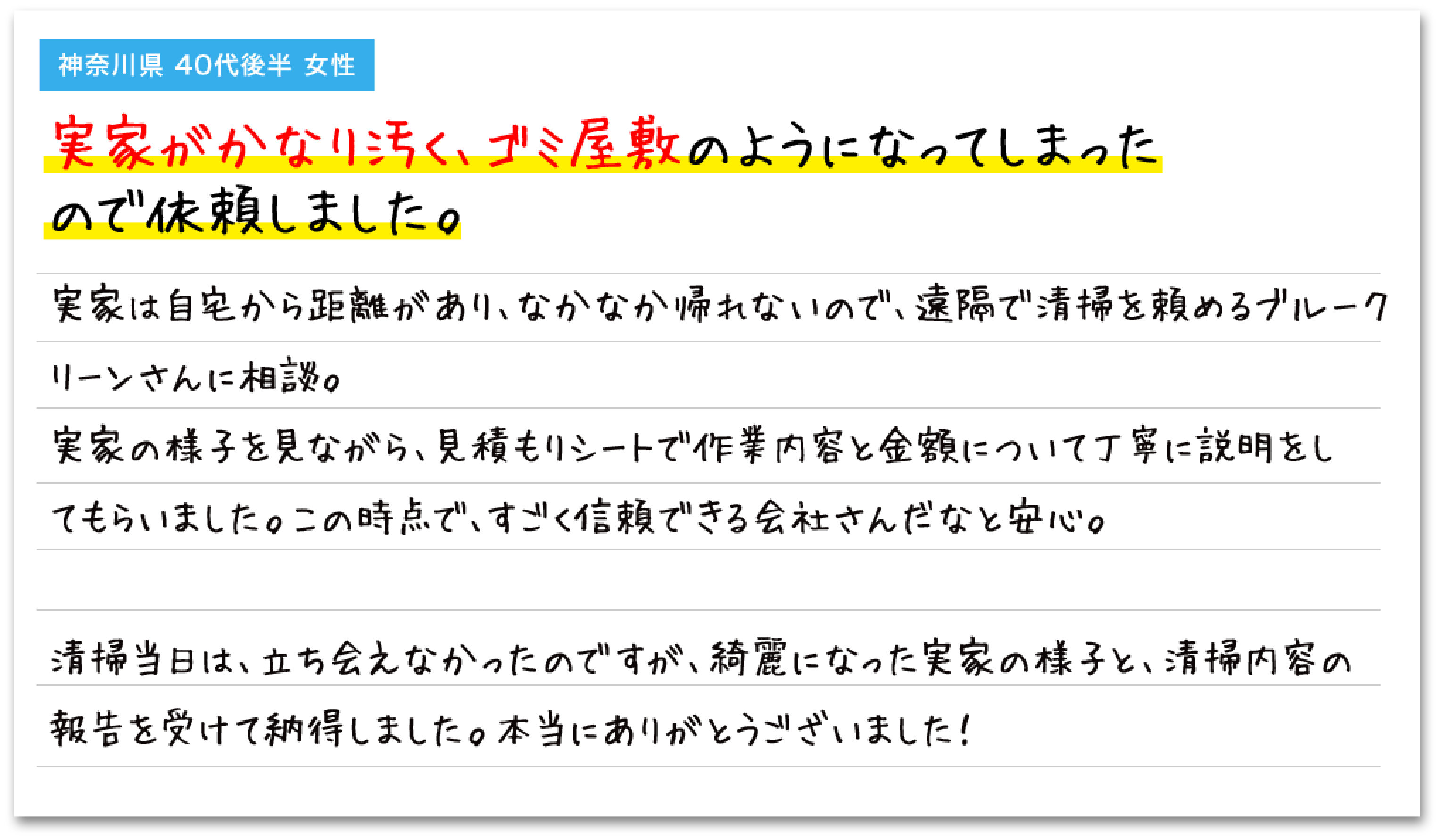 万が一、作業範囲に大幅な変更(想定外の荷物の追加など)が生じる場合は、必ず作業着手前にご相談し、 ご納得いただいた上で再提案させていただきます。